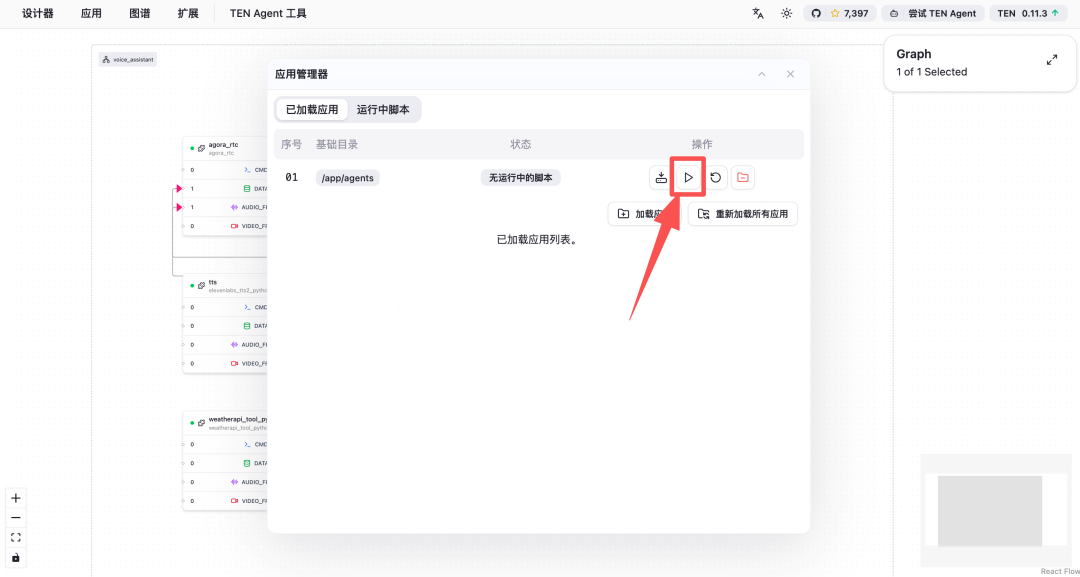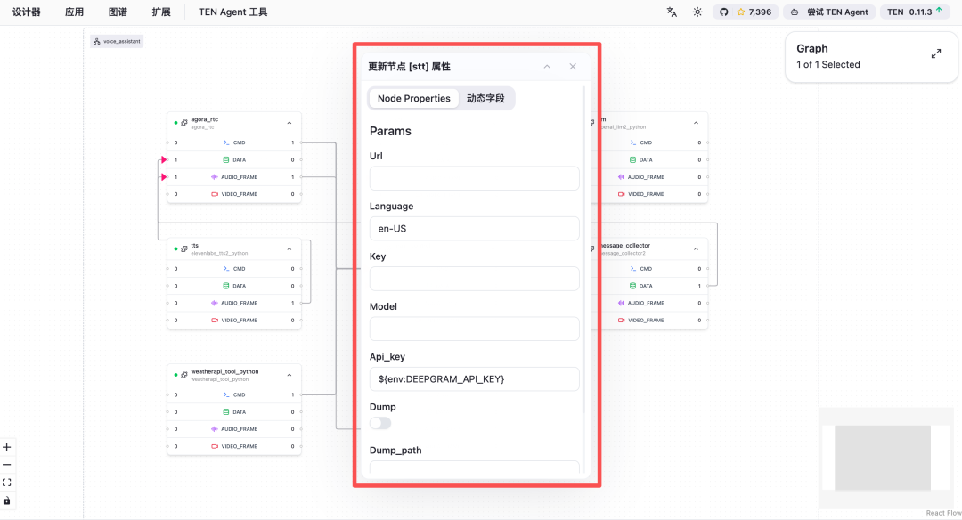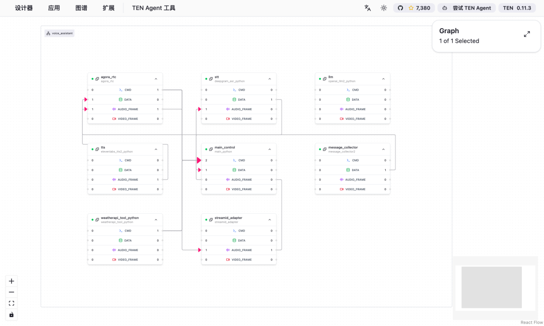 即可看到可视化拖拽式的 TEN Agent 工作流构建界面: