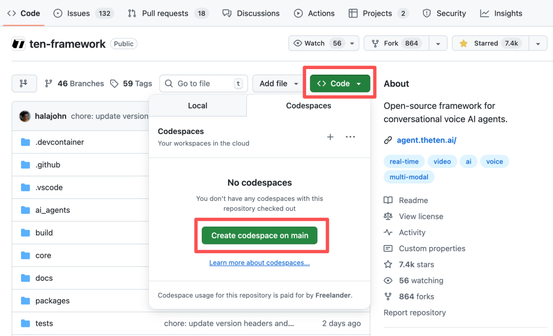 1、首先访问 TEN 的 GitHub 项目,创建一个新的 codespace: