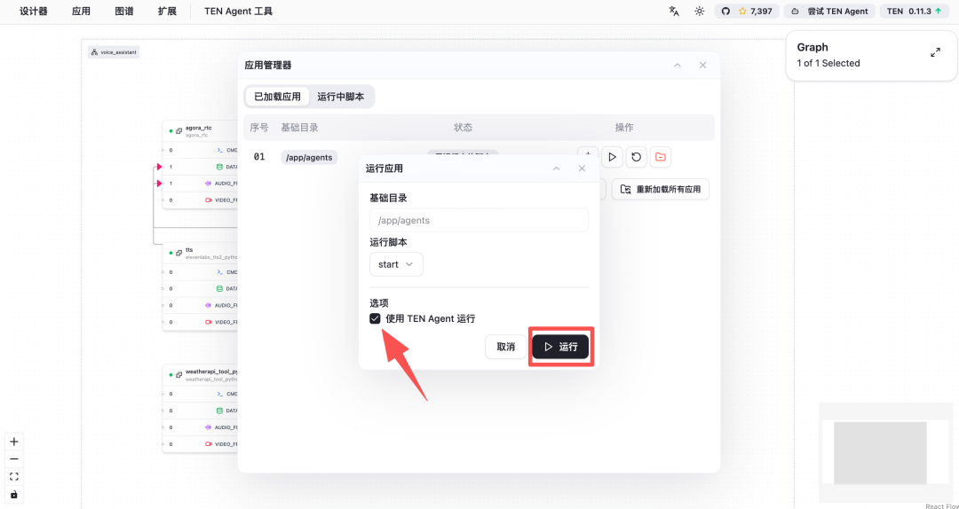 接着,弹出勾选「使用 TEN Agent 运行」选项,点击「运行」按钮: