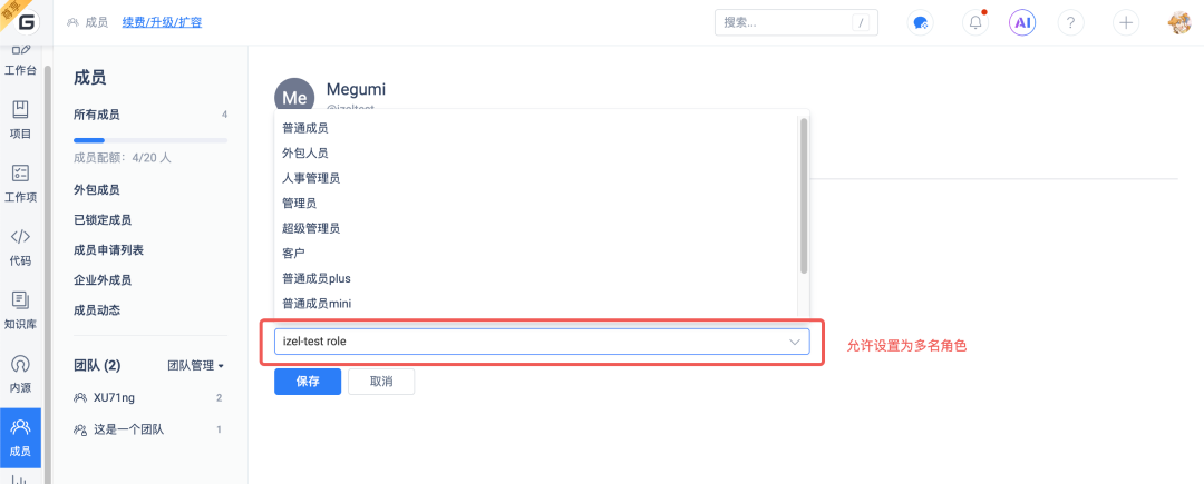 - 支持单个成员绑定多个角色,权限范围按角色并集计算;