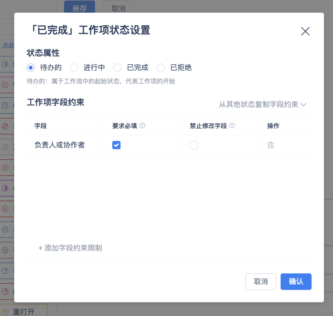 新增字段约束机制,支持状态触发字段必填 / 禁止修改,并允许跨状态快速复制配置。