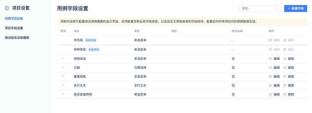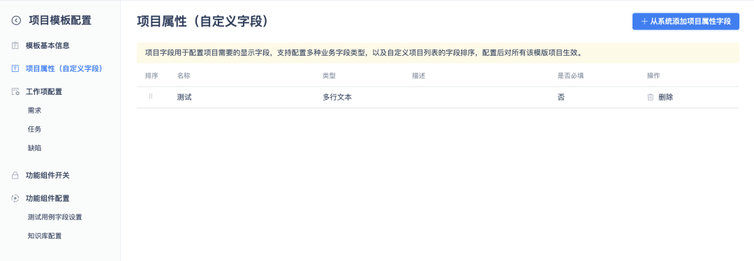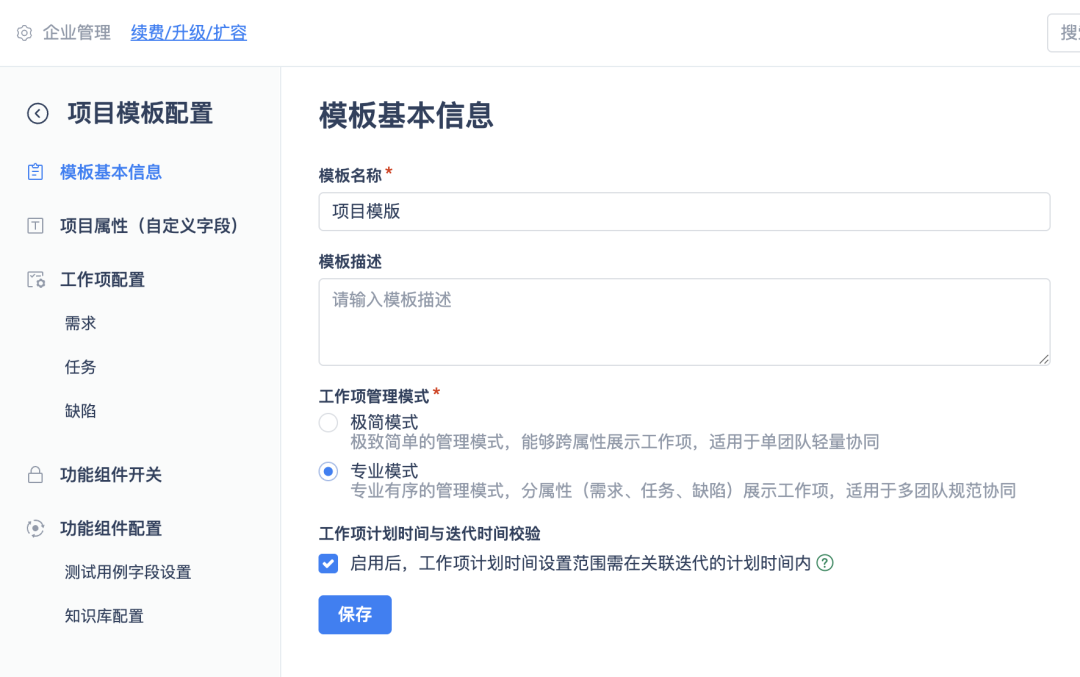 - 模板中可预设字段、模块、工作项类型与功能组件开关;