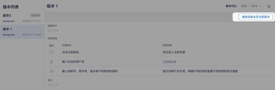 - 用例历史版本支持复制为当前或新版本,支持智能差异生成。