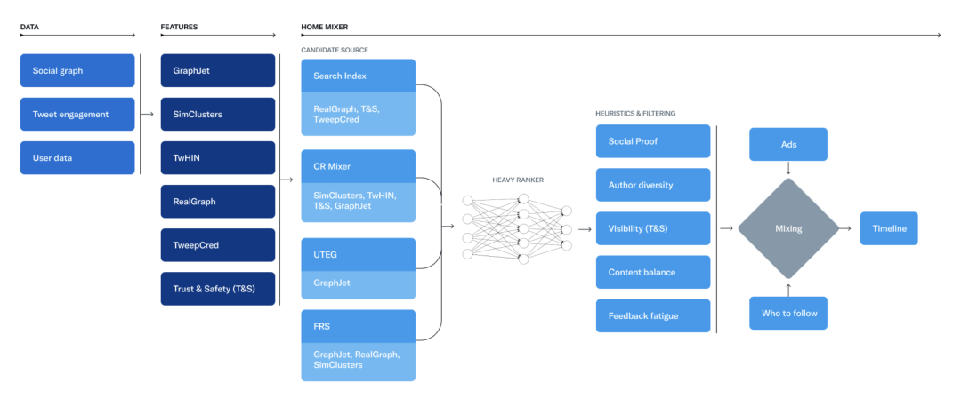 包含了一系列服务、任务和框架,它们共同协作,来决定用户会在「为你推荐」时间线、搜索、探索页和通知中看到什么内容。