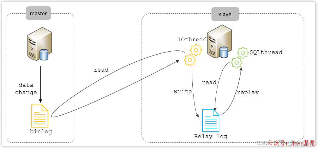 主从复制用于MySQL主从集群的主节点向从节点同步数据,主要是依靠MySQL的binLog实现的,大体流程分为三步: