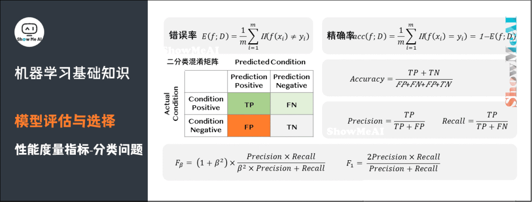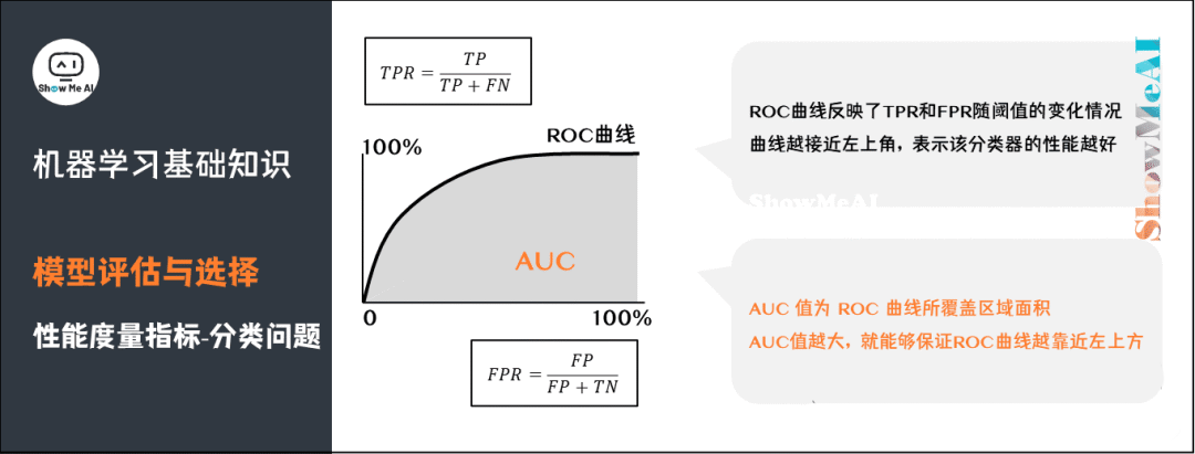 均方根误差(Root-Mean-Square Error,RMSE),也称标准误差,是在均方误差的基础上进行开方运算。RMSE会被用来衡量观测值同真值之间的偏差。R平方,决定系数,反映因变量的全部变异能通过目前的回归模型被模型中的自变量解释的比例。比例越接近于1,表示当前的回归模型对数据的解释越好,越能精确描述数据的真实分布。分类问题常用的性能度量指标包括错误率(Error Rate)、精确率(Accuracy)、查准率(Precision)、查全率(Recall)、F1、ROC曲线、AUC曲线和R平方等。查准率(也称准确率),即在检索后返回的结果中,真正正确的个数占你认为是正确的结果的比例。查全率(也称召回率),即在检索结果中真正正确的个数,占整个数据集(检索到的和未检索到的)中真正正确个数的比例。F1是一个综合考虑查准率与查全率的度量,其基于查准率与查全率的调和平均定义:即:F1度量的一般形式-Fβ,能让我们表达出对查准率、查全率的不同偏好。ROC曲线(Receiver Operating Characteristic Curve)全称是「受试者工作特性曲线」。综合考虑了概率预测排序的质量,体现了学习器在不同任务下的「期望泛化性能」的好坏。ROC曲线的纵轴是「真正例率」(TPR),横轴是「假正例率」(FPR)。AUC