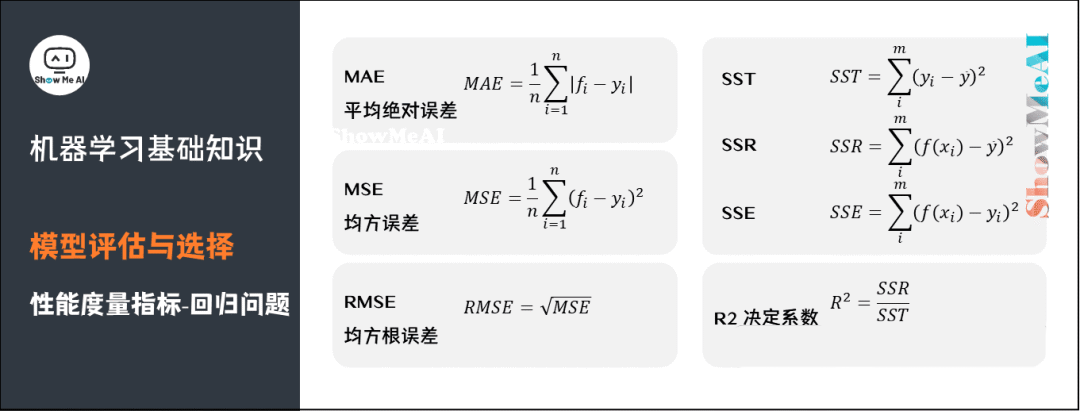 是衡量模型泛化能力的数值评价标准,反映了当前问题(任务需求)。使用不同的性能度量可能会导致不同的评判结果。关于模型「好坏」的判断,不仅取决于算法和数据,还取决于当前任务需求。回归问题常用的性能度量指标有:平均绝对误差、均方误差、均方根误差、R平方等。平均绝对误差(Mean Absolute Error,MAE),又叫平均绝对离差,是所有标签值与回归模型预测值的偏差的绝对值的平均。平均绝对百分误差(Mean Absolute Percentage Error,MAPE)是对MAE的一种改进,考虑了绝对误差相对真实值的比例。均方误差(Mean Square Error,MSE)相对于平均绝对误差而言,均方误差求的是所有标签值与回归模型预测值的偏差的平方的平均。