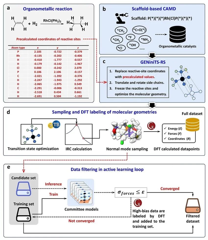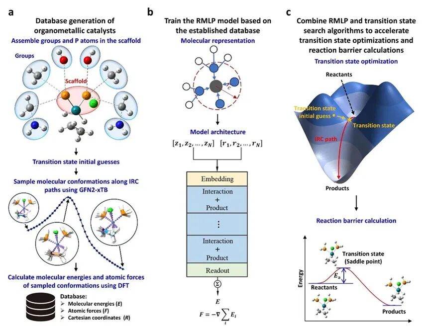机器学习势函数方法已在药物化学、材料科学、非均相催化等多个领域展现出了巨大的应用前景。然而,由于有机金属催化反应势能面的复杂性,以及缺乏包含过渡金属和多样配体的高质量反应数据库,均相有机金属催化领域的RMLP应用潜力仍未得到有效发掘。为此,本研究提出了一种RMLP加速有机金属催化剂配体筛选的工作流(如图1所示),主要包括三个步骤:数据库自动化构建、RMLP模型训练、过渡态搜索与反应势垒预测。