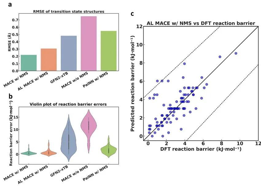 研究进一步在100个随机外部测试反应中,对比不同模型的过渡态优化几何结构误差与反应势垒预测精度。如图3所示,AL MACE w/NMS模型性能优异,过渡态结构优化与IRC计算成功率为93%(相较于DFT基准),几何结构误差RMSE = 0.307 Å,反应势垒预测误差MAE = 0.871 kJ•mol