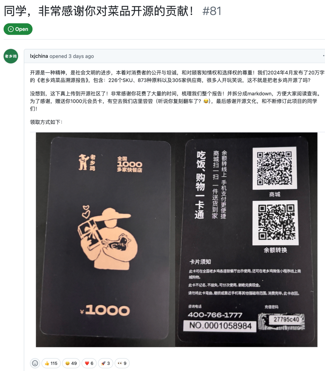 此后,老乡鸡官方在该仓库的 Issue 中发起“程序员福利”活动,称上一次的储值卡“没有被作者本人领走😭”,并表示新卡将直接发送至作者邮箱。