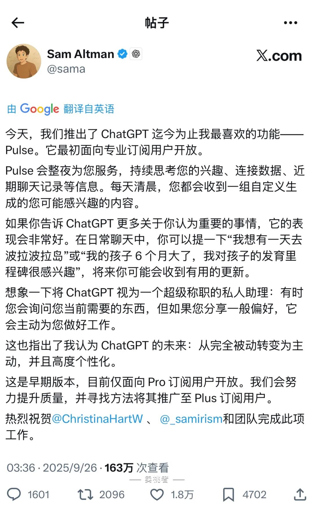 北京时间凌晨,山姆·奥特曼宣布:OpenAI 为 Pro 用户上线了了一个新功能:ChatGPT Pulse 预览版,后续会扩展到 Plus 用户,最终面向所有人。