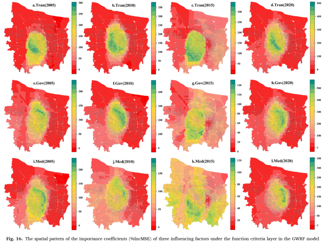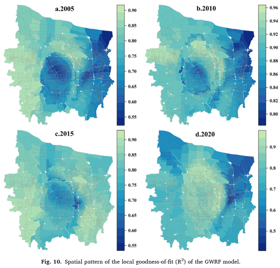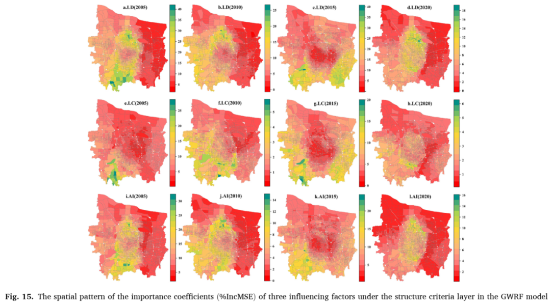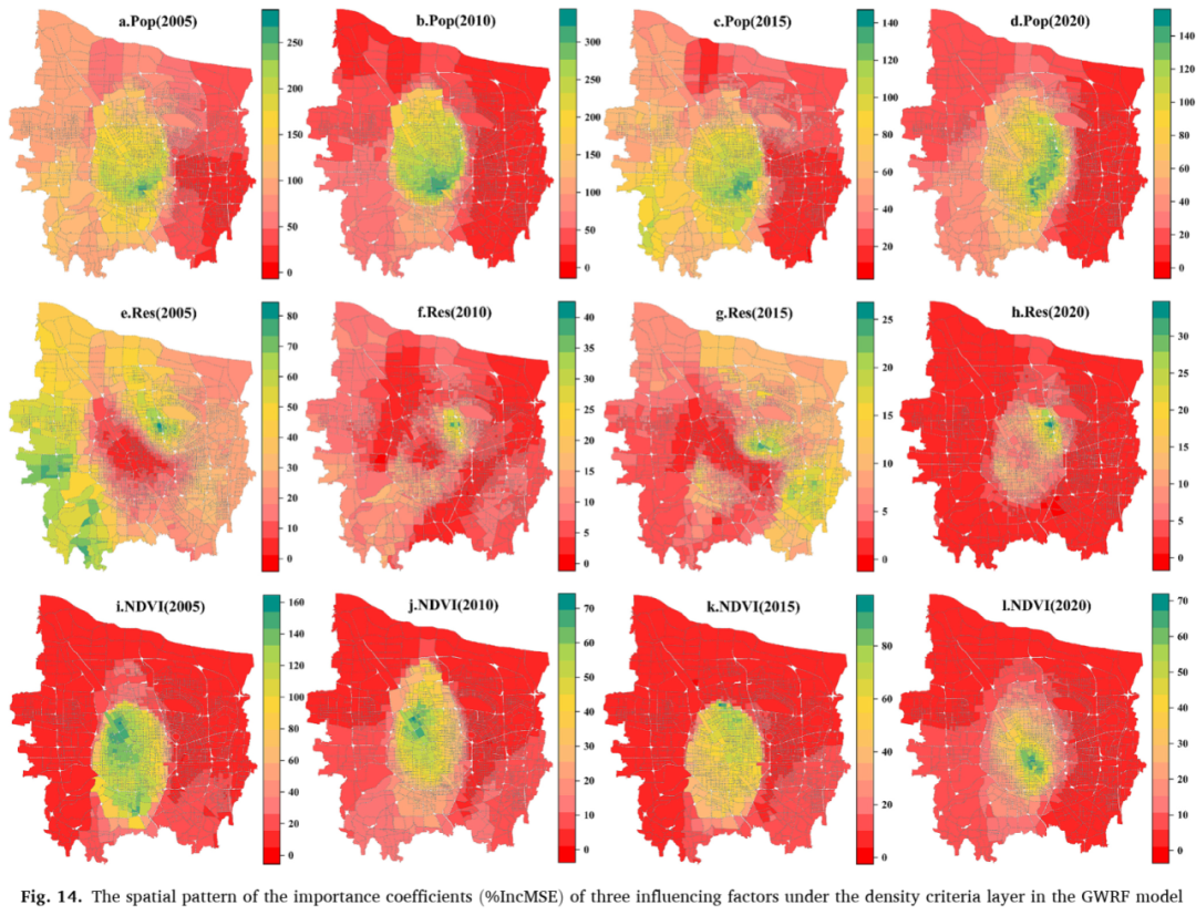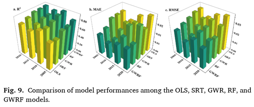 GWRF模型的应用:通过地理加权随机森林模型,研究识别了影响城市韧性的关键因素,并揭示了这些因素在不同空间位置的非线性效应。该模型在处理复杂空间数据时表现出色,显著提升了模型的解释力和预测精度。
