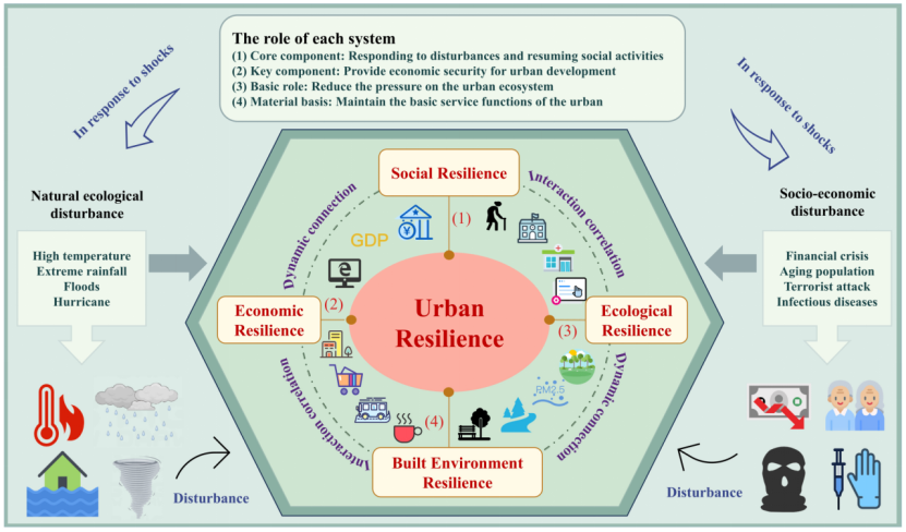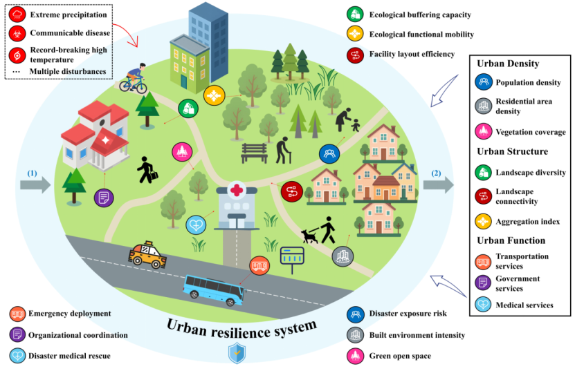 系统性研究框架:作者构建了一个“密度—结构—功能”(Density-Structure-Function, D-S-F)框架,将景观生态学、城市功能空间和复杂系统理论相结合,为城市韧性评估提供了一个系统性的分析框架。这一框架不仅强调了城市功能的重要性,还综合考虑了城市密度和结构的动态交互作用。