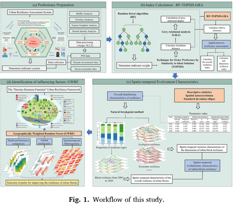 RF-GRA-TOPSIS评估方法:该方法通过随机森林自动提取特征权重,结合灰色关联分析和TOPSIS方法,有效处理高维数据中的非线性关系和空间距离敏感性问题,为城市韧性评估提供了一种新的量化工具。