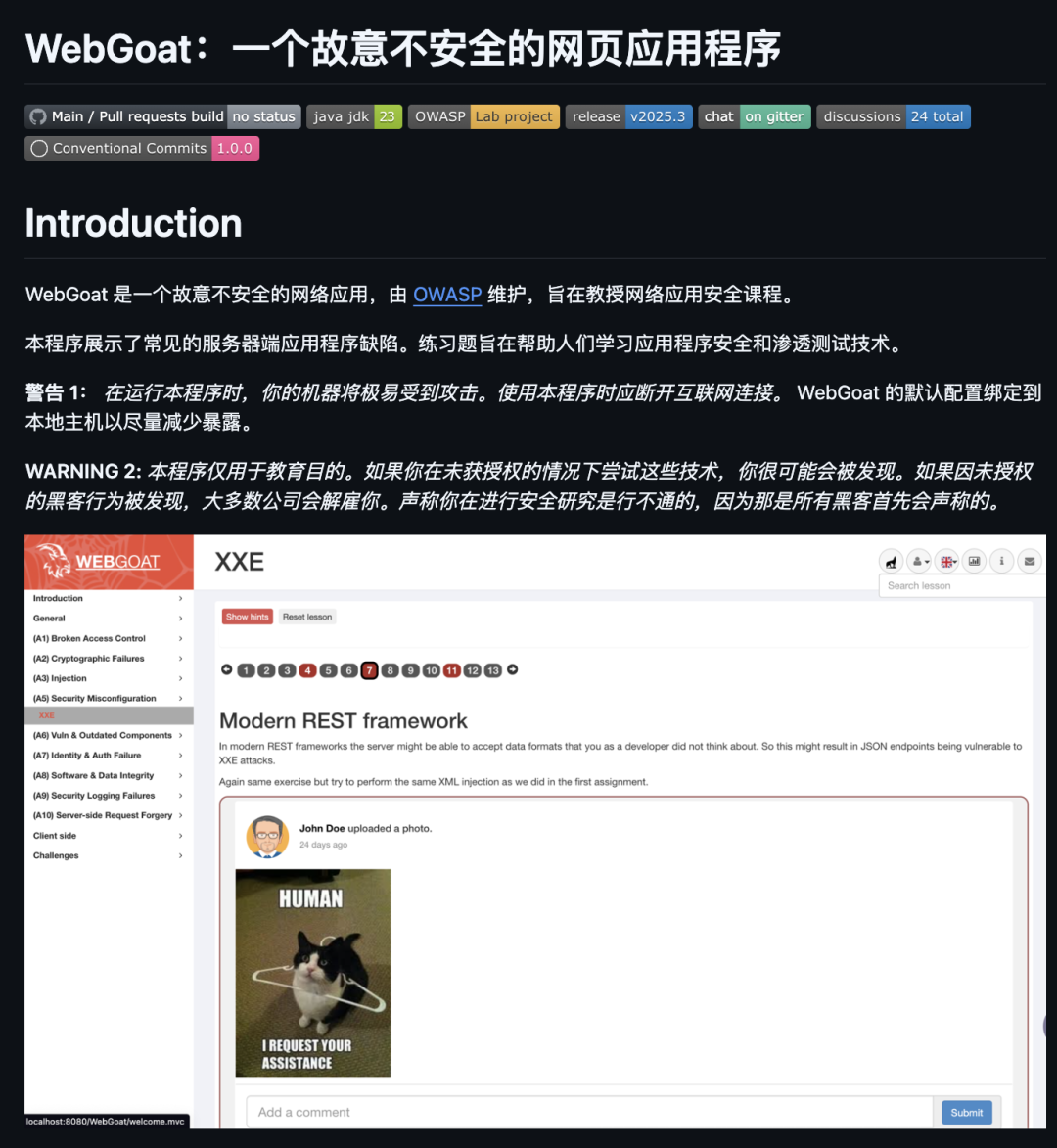 不过在使用前要注意:运行 WebGoat 时你的电脑会非常脆弱,最好断开网。项目默认绑定到本地地址以减少风险,但安全起见还是隔离网络环境为好。