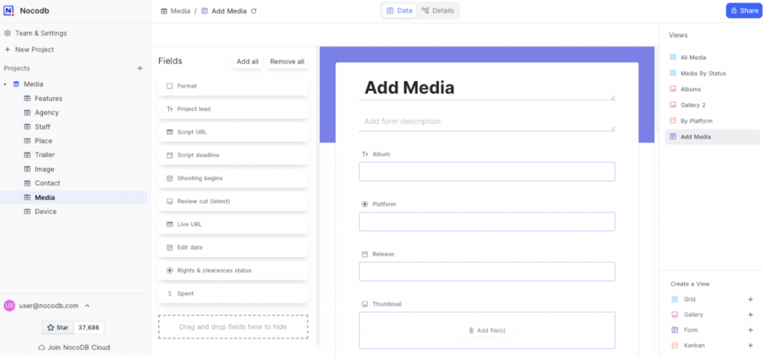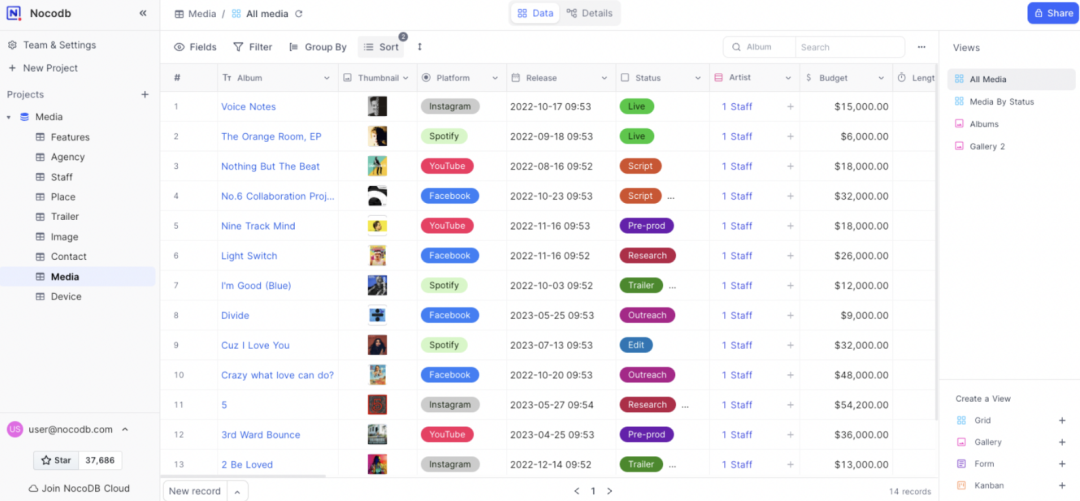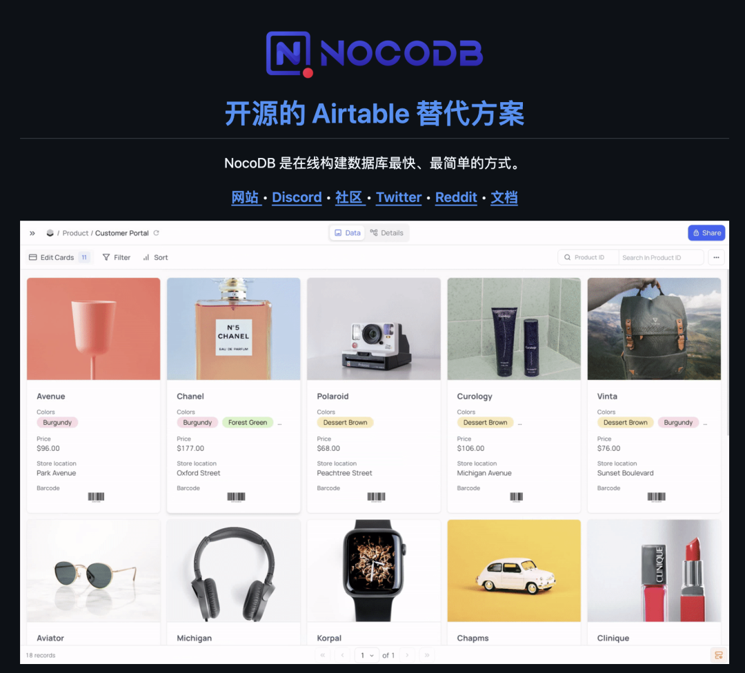 国外很火的 Airtable 的开源替代,NocoDB有丰富的电子表格界面,支持网格、画廊、看板等多种视图。