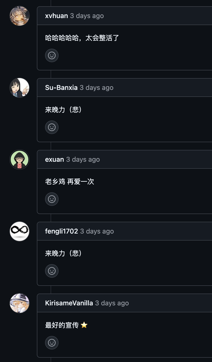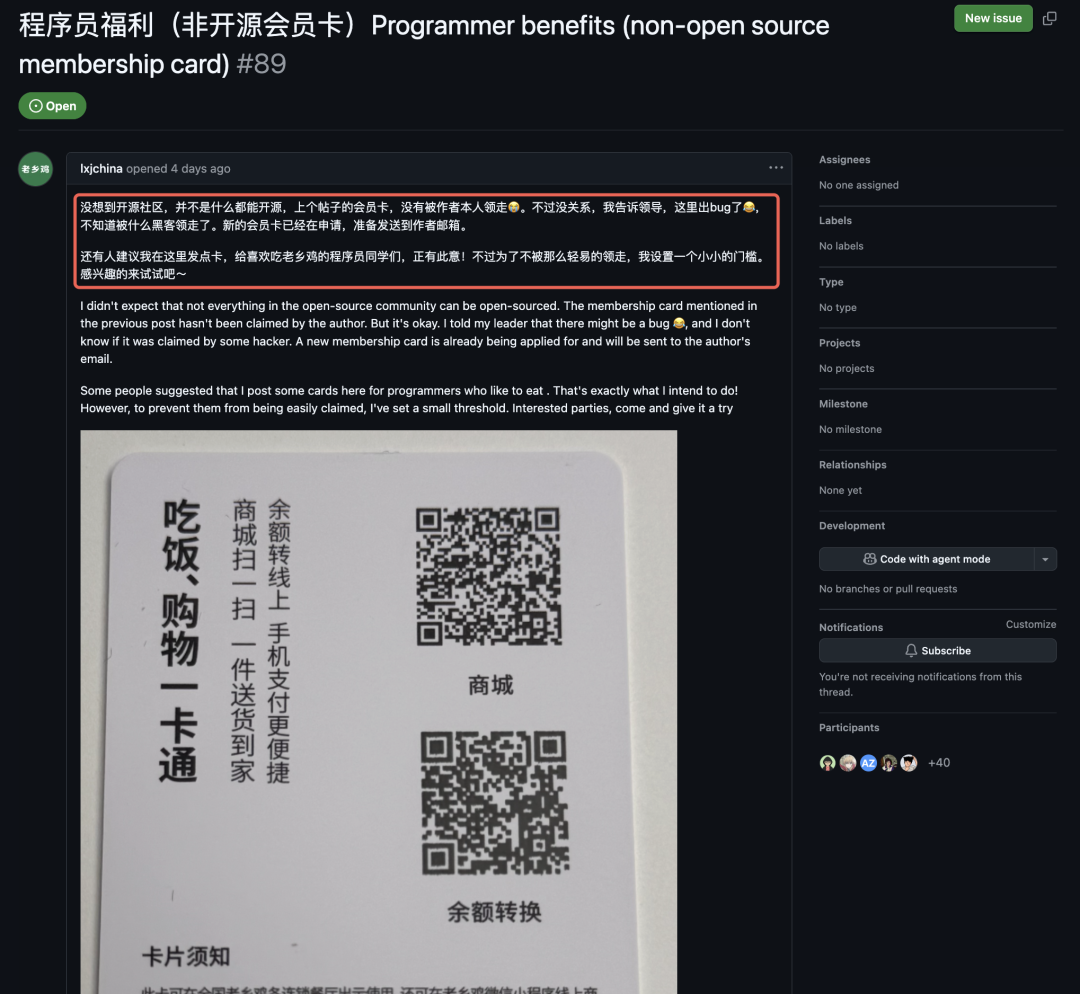 老乡鸡官方看到这么热门的开源项目,直接注册了 GitHub 账号。跑到 issus 里面去送会员卡了。。。
