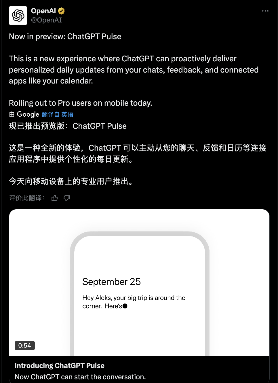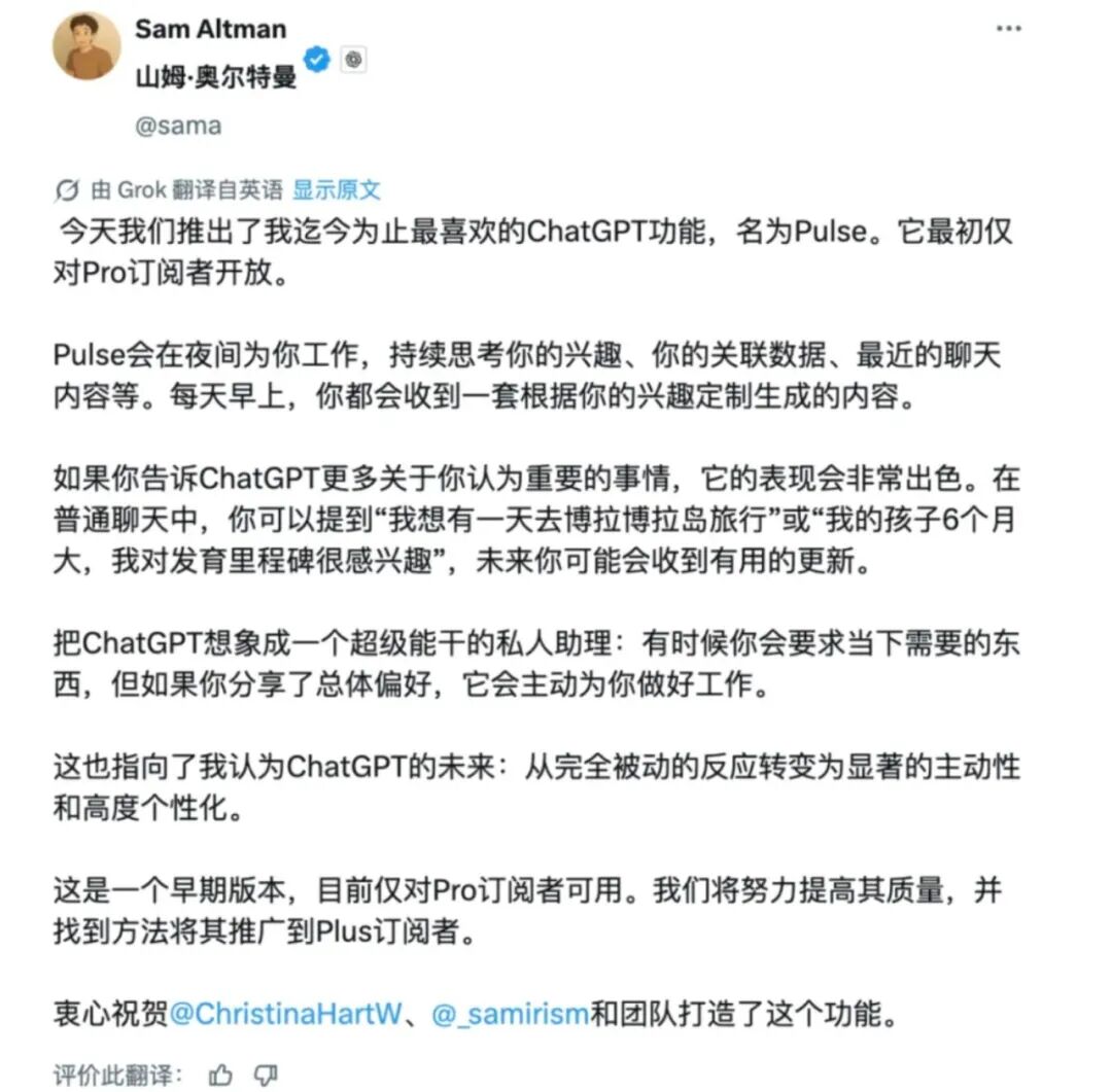 9月26日,OpenAI推出ChatGPT Pulse功能,不少人称它为AI助理的“抖音时刻”。