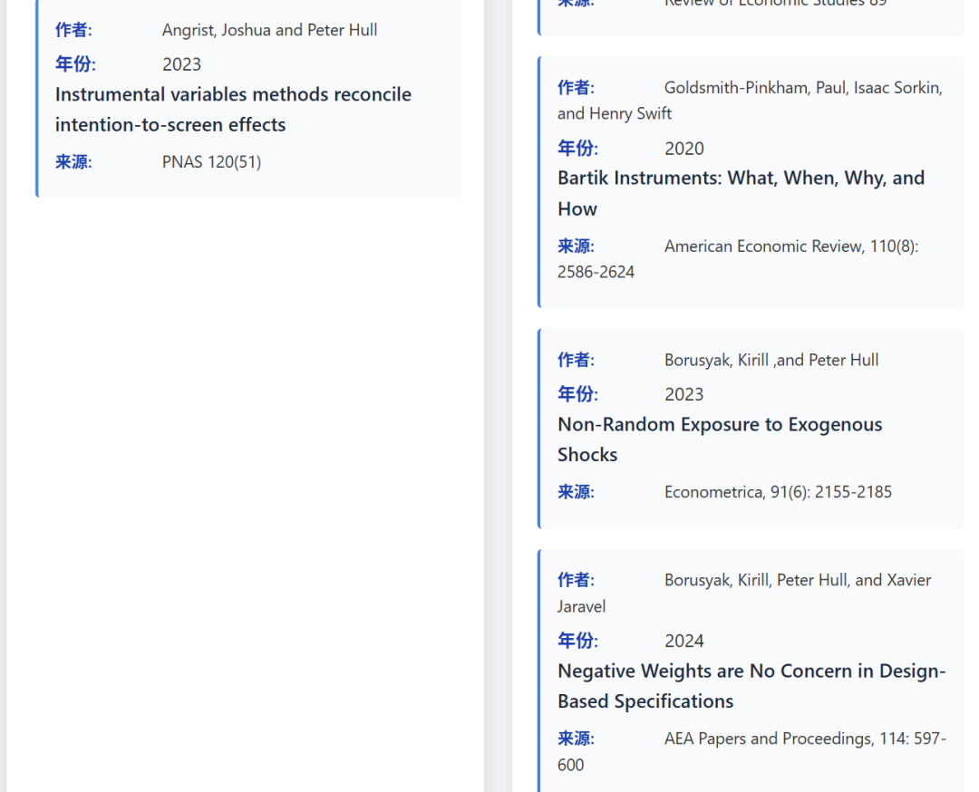 Borusyak, Kirill, Peter Hull, and Xavier Jaravel (2024)): “Design-Based Identification with Formula Instruments: A Review,” Econometrics Journal, forthcoming