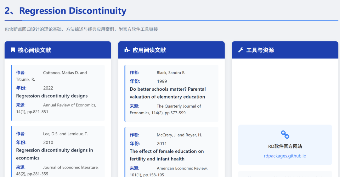 Lee, D.S. and Lemieux, T., 2010. Regression discontinuity designs in economics. Journal of Economic literature, 48(2), pp.281-355.