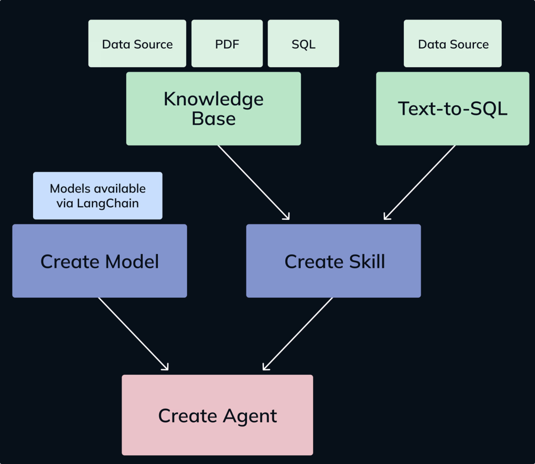 此外还可以在客户端通过SDK来调用;甚至通过A2A协议调用这个Agent。MindsDB的Agent本质上是一个LangChain实现的服务端Agent,只是MindsDB自动完成了一些工作,包括工具的创建和提示词的设定等。内部架构如下:当用户提出问题时,Agent会借助它的两大技能完成数据检索,获得参考的上下文,最后组织答案并输出。- 知识库查询:对知识库执行语义检索,并返回相似的记录