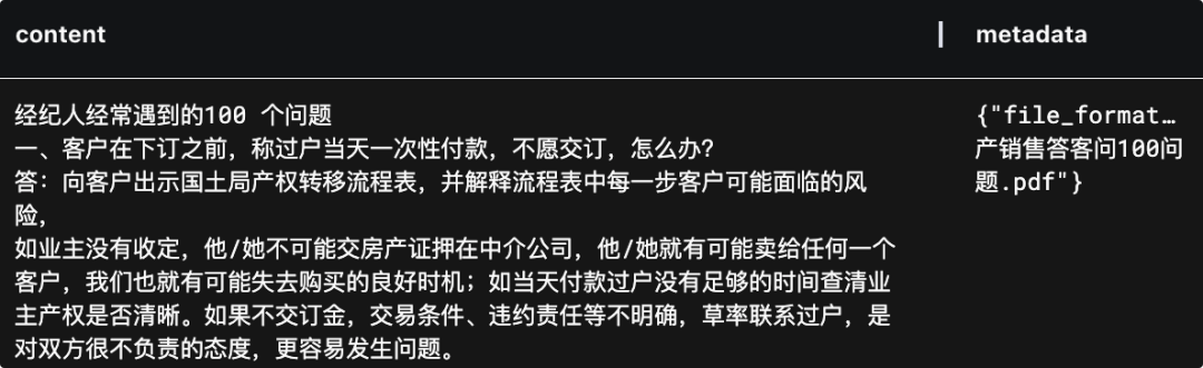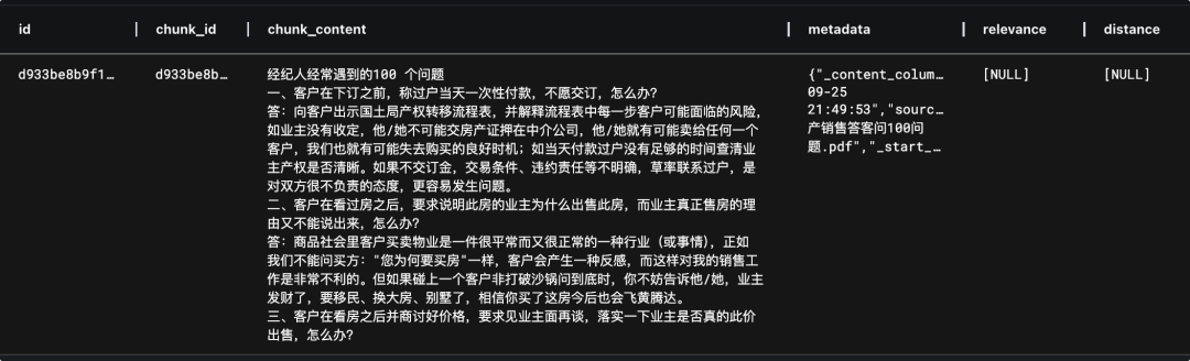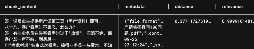 注意MindsDB知识库的结构是固定的,包括ID、chunk_id、chunk_content、metadata等列,这些数据正是根据你在创建时的参数从数据源生成:当然这样的检索并无实际意义。知识库最大的价值是可以进行语义检索,比如:select * from my_sales_question_kb