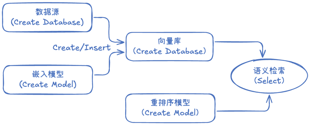 现在你可以查询这个向量库中的“表”实现语义检索、拓展应用(如RAG)。尽管这个过程已经非常直观与友好,但是你仍然需要如下步骤:- 映射数据源(DB或者文件):用来读取需要向量化的数据