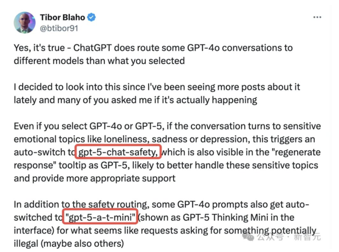 这件事迅速在网上发酵。很多用户指出,当他们聊情感类话题、敏感内容时,原本选定的 GPT-4 或 GPT-5 模型被系统偷偷切换成「敏感模型」。而 GPT-5 的「降配」并不在任何官方文档里说明。种种迹象表明,这背后可能是 OpenAI 为了「安全考量」或资源调配,做出的模型路由改动。