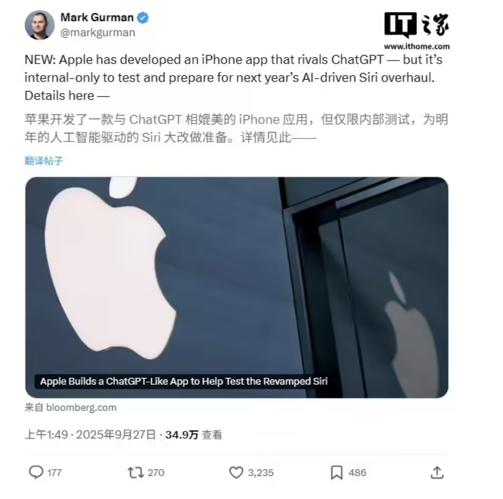 9 月 28 日,彭博社马克·古尔曼报道称,苹果在 AI 战略上正逐步调整方向,Apple Intelligence 发布后反响平平后,该公司已在内部测试一款类似 ChatGPT 的聊天机器人应用,代号 Veritas。不过,该应用目前仅用于验证新一代 Siri 技术,并未计划对消费者开放。