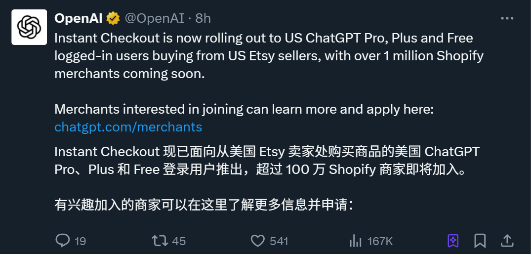 OpenAI顺带提醒,商家目前是否开通了即时结账不影响产品在此处露出(毕竟还有其他考虑因素)。