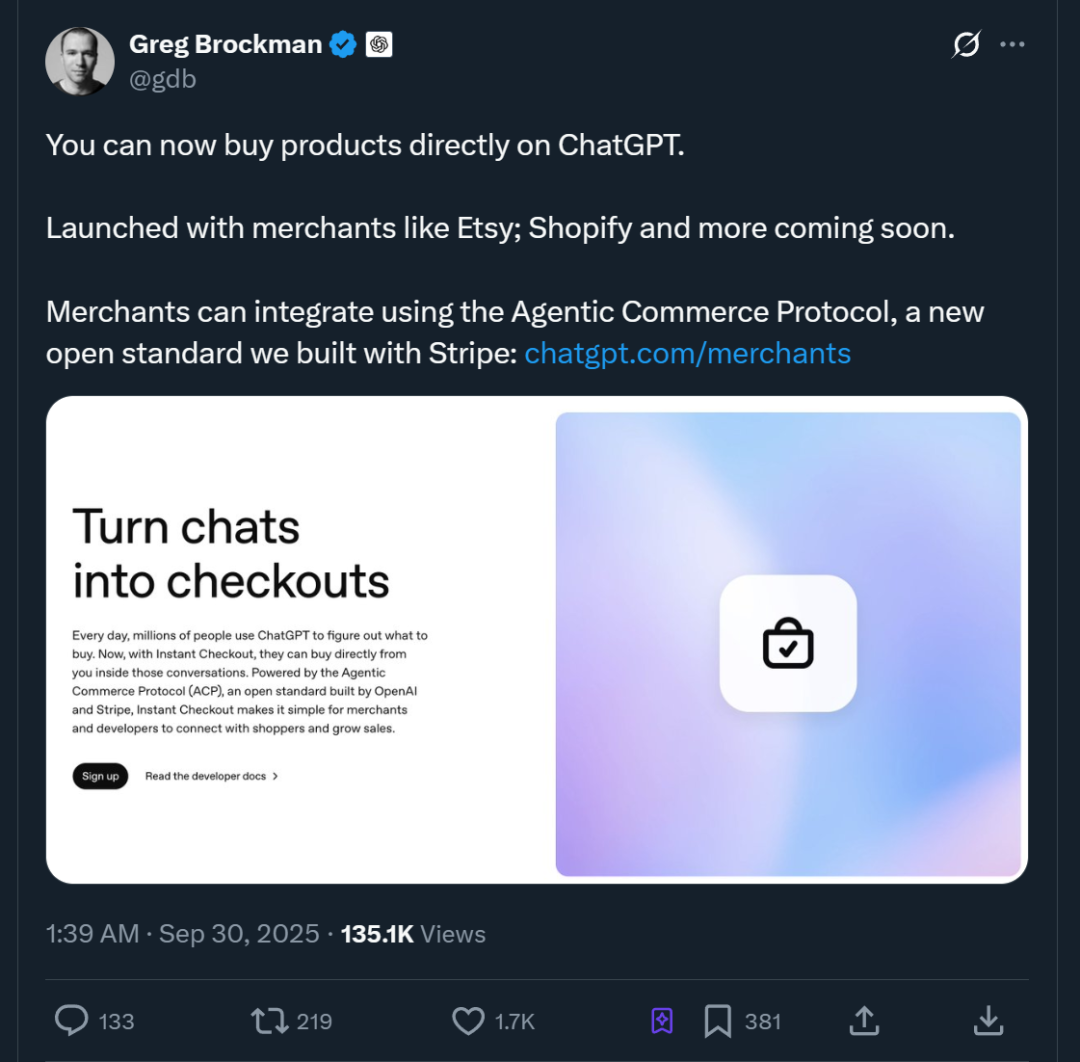 为了打通聊天和支付,OpenAI特意联合Stripe(当红的新锐支付公司,OpenAI现任总裁之前担任CTO,OpenAI英伟达等大公司都是其客户)共同构建了全新开放协议——Agentic Commerce Protocol(ACP)。