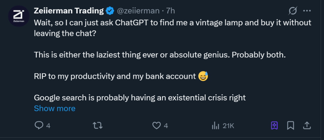 抛开OpenAI庞大的用户群不谈,其背后更深层的逻辑或许在于:OpenAI这一新功能简直是在拳打谷歌商业模式,脚踢亚马逊命门。
