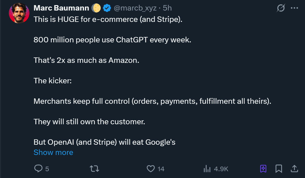 每周有8亿人使用ChatGPT,这是亚马逊的两倍……OpenAI(和Stripe)将会抢走谷歌和亚马逊的市场份额。