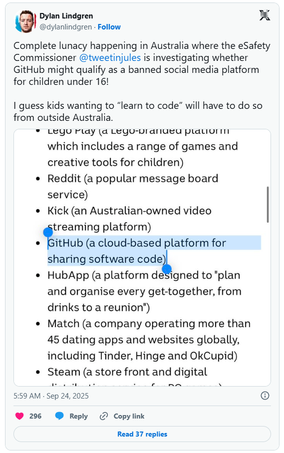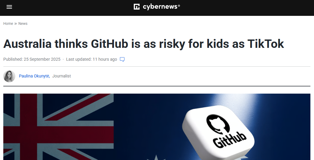 澳大利亚电子安全委员会近日向开源代码共享平台GitHub发出正式函件,要求其评估是否应被归类为可能危害未成年人的“社交媒体平台”。这意味着GitHub有可能与Facebook、Instagram、TikTok等社交网络一起被列入监管名单,禁止16岁以下青少年使用。
