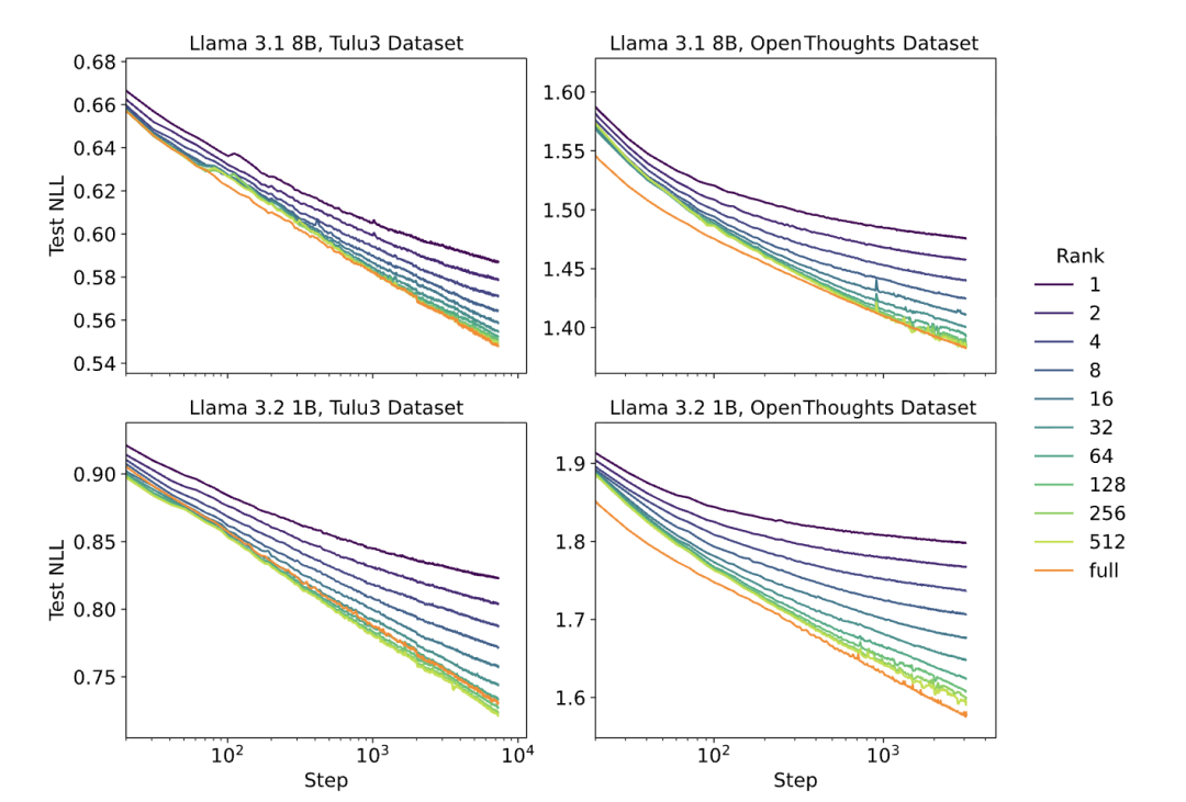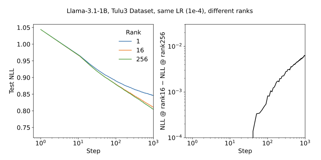 结果显示高秩LoRA(如秩512)的学习曲线与FullFT几乎完全重合,两者的损失值均随训练步数呈对数线性下降趋势;