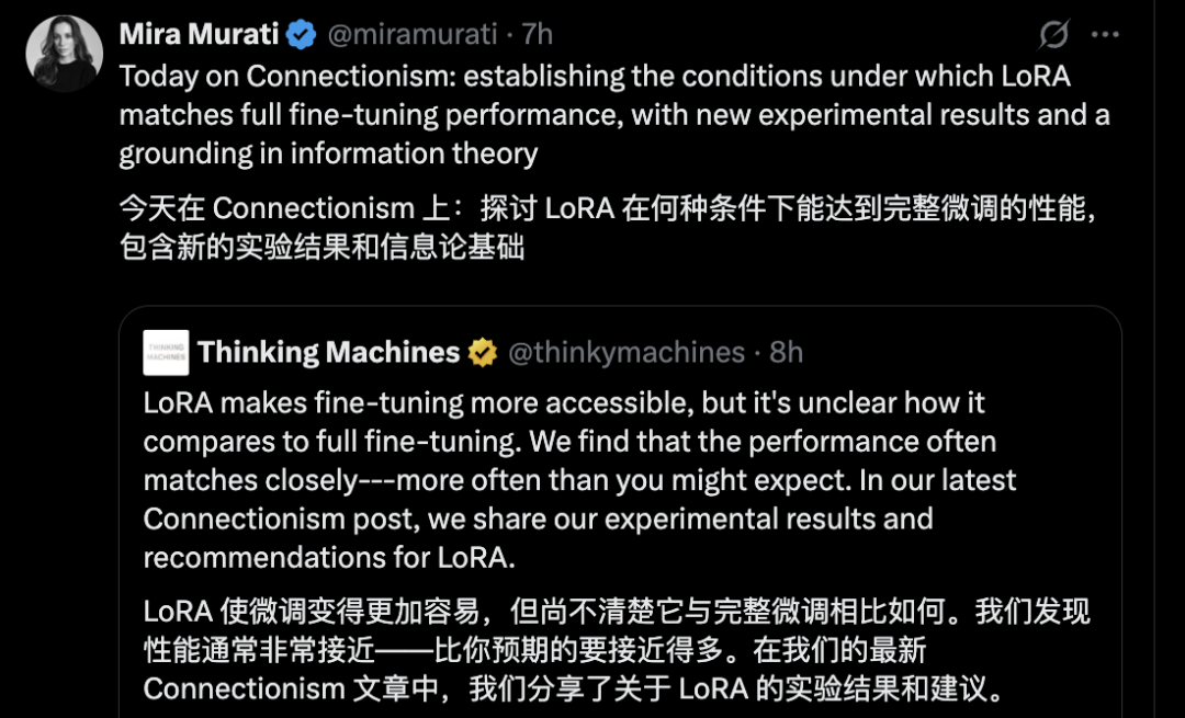 Thingking Machines创始人、OpenAI前CTO Mira Murati继续转发站台。