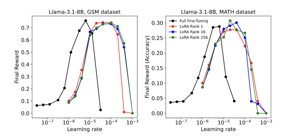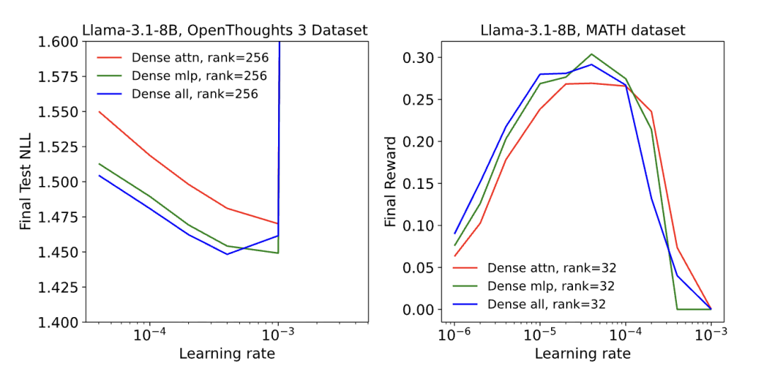 许多使用者曾因超参数调试复杂对LoRA望而却步,但研究发现,LoRA的最优学习率存在明确规律——始终约为FullFT的10倍。(为观察结果,团队表示还将进一步完善理论框架)
