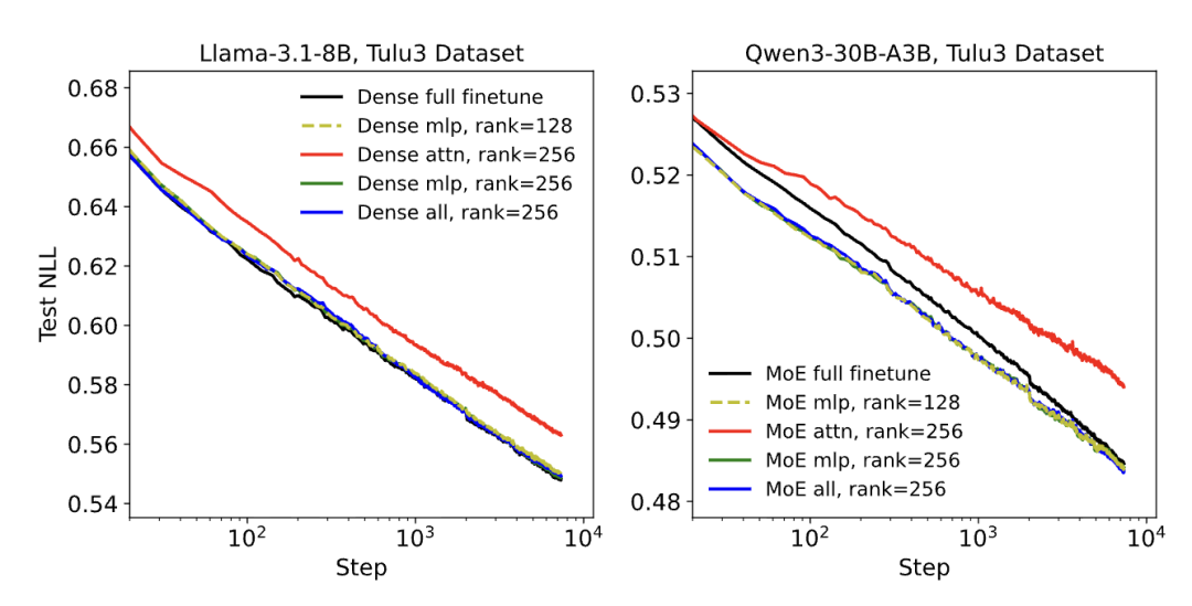 而当LoRA应用于模型所有层,尤其是参数占比最高的MLP层与MoE层时,性能得到极大提升,甚至仅在MLP层单独应用LoRA,效果就与“MLP层+注意力层”组合应用相差无几。