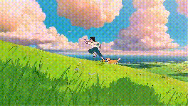 Prompt: in the style of a studio ghibli anime, a boy and his dog run up a grassy scenic mountain with gorgeous clouds, overlooking a village in the distant background