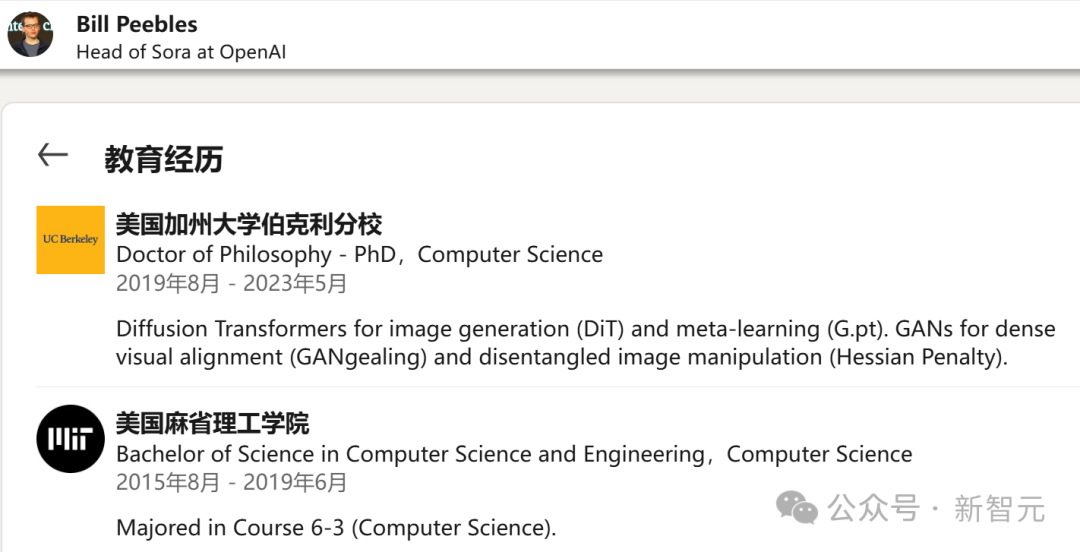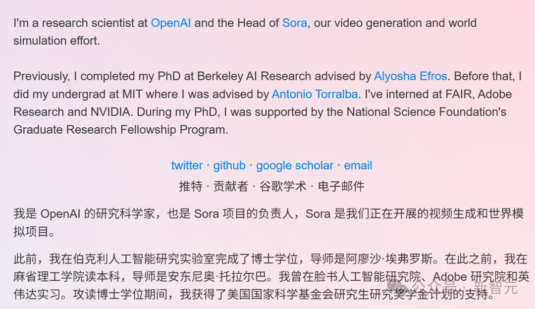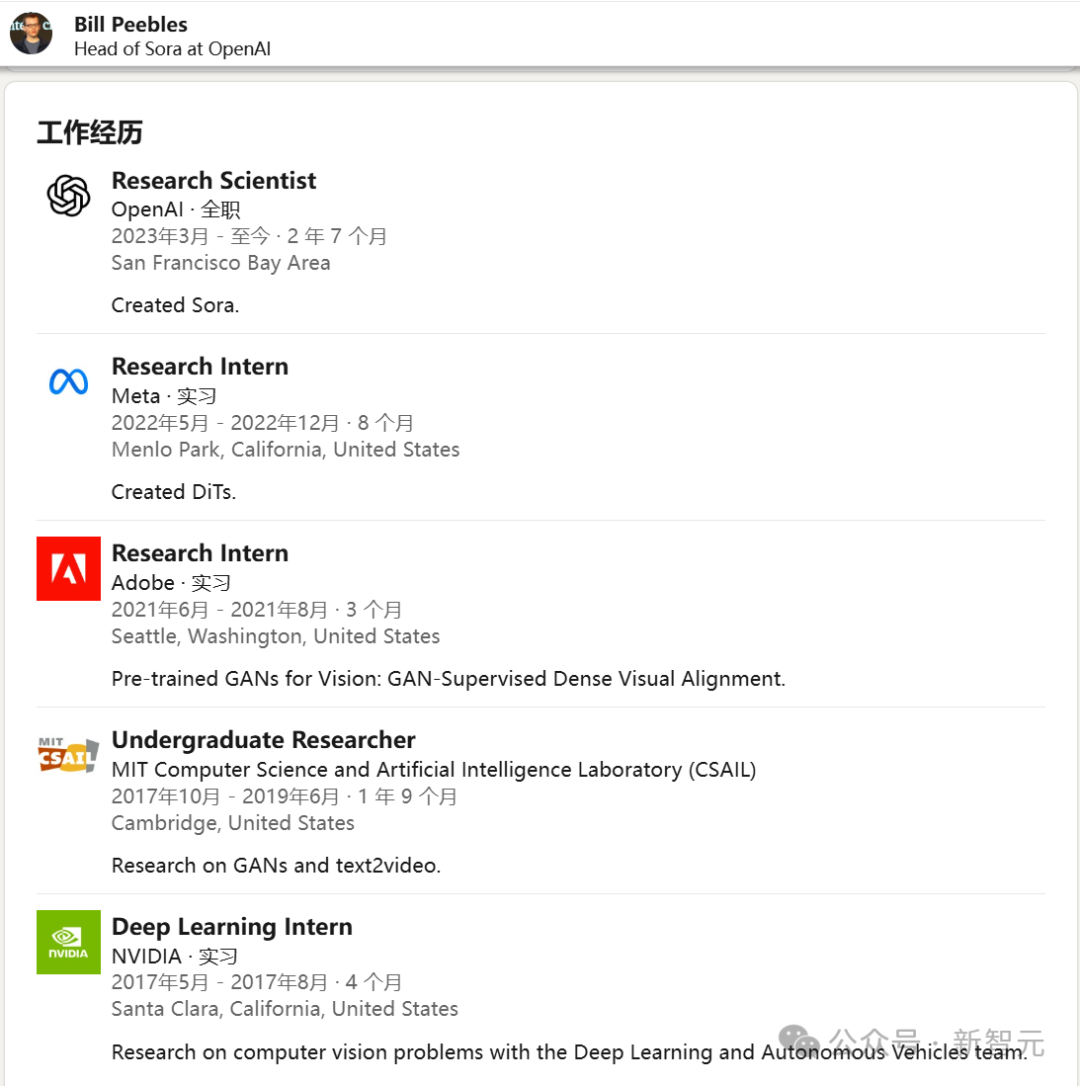 他曾先后在英伟达、Adobe、Meta的AI岗实习,博士毕业后直接加入了OpenAI,工作的最大业绩是Created Sora(创造出了Sora)。