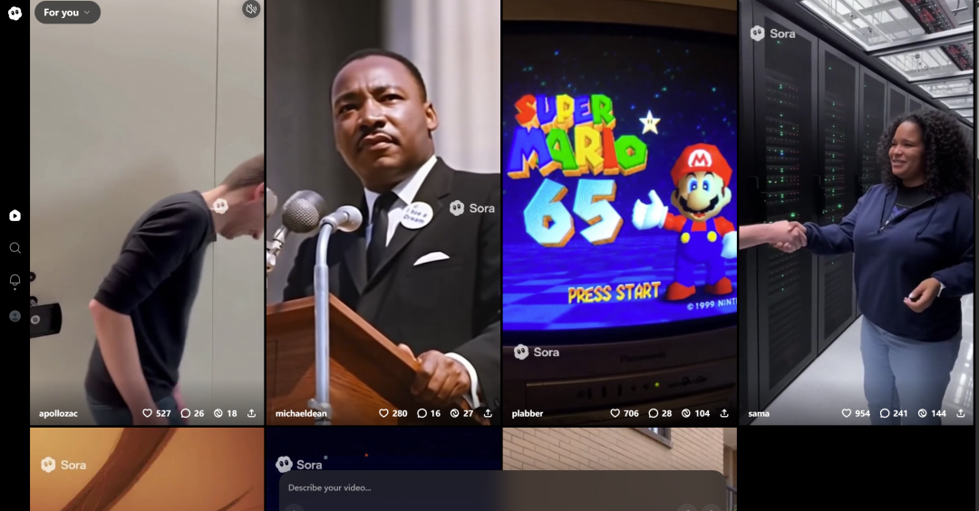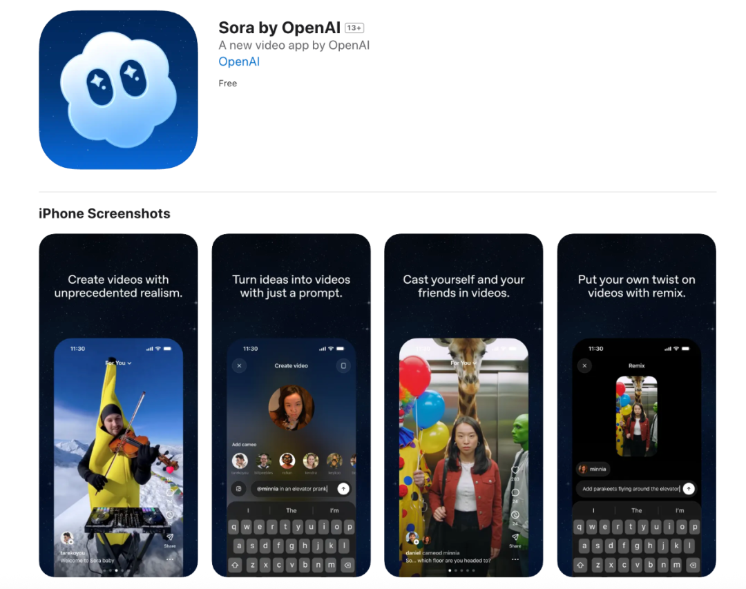 Sora App 的界面设计看起来非常像抖音,包括内容流、个人主页等界面,不过APP的短视频均为AI生成。在这个APP中,用户可自定义的Sora动态中浏览新视频,并通过“客串(Cameos)”功能将自己或好友引入到视频中。同时,为了保护肖像权,用户在APP中能够完全掌控自己的形象使用权,可随时撤销权限或删除含有本人 Cameo 的视频。