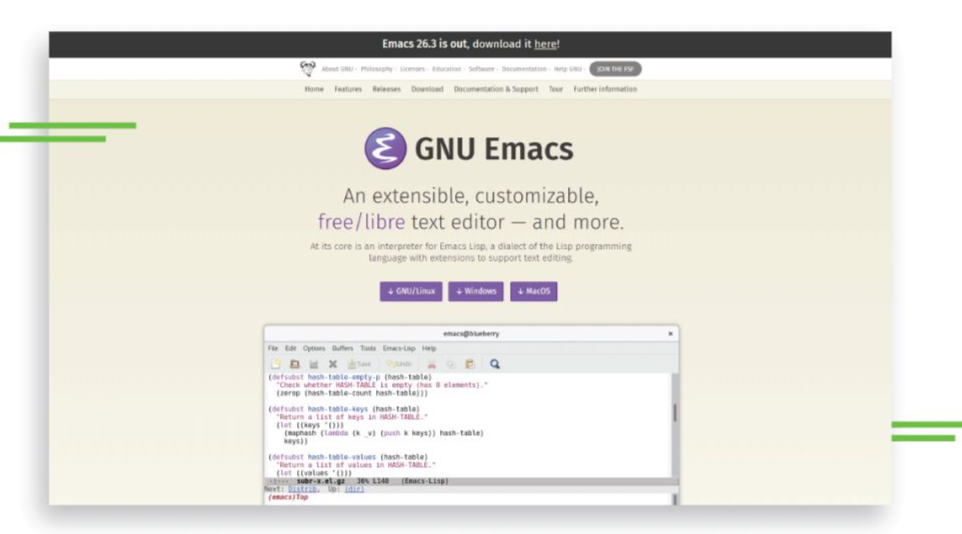 其 modal editor 需要用户花费一定时间学习。 GNU Emacs 下载地址: https://www.gnu.org/software/emacs/emacs.html