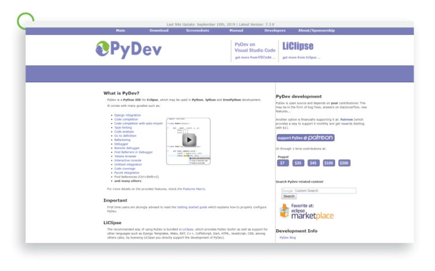 Eclipse + PyDev 下载地址: https://www.eclipse.org/ https://www.pydev.org/