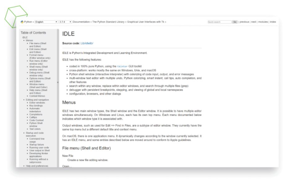 用户可能需要多花一点时间,来学习该编辑器的复杂自定义过程。 IDLE 下载地址: https://docs.python.org/3/library/idle.html
