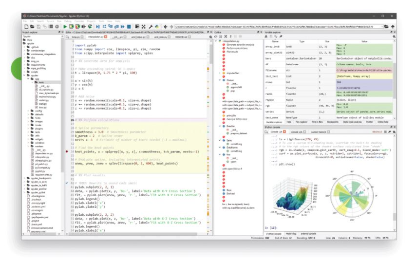 Spyder 是为数据科学而开发的。它是开源工具,能够与大量平台兼容,因而成为 IDE 新手用户的更好选择。为实现完美开发,它合并了多个关键库,如 NumPy、Matplotlib 和 SciPy。
