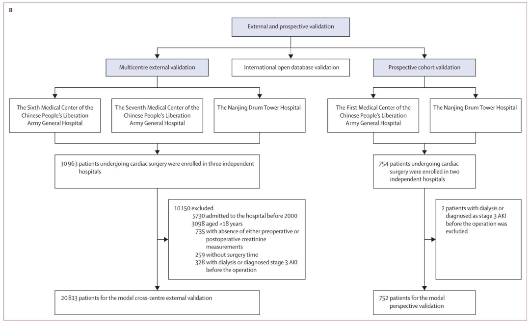 方法:本研究为回顾性模型开发与前瞻性验证研究,纳入了来自7个不同队列、接受大型心脏直视手术的成年患者(年龄≥18岁),用于模型的训练与验证。模型开发和内部验证的数据来源于2000年1月1日至2022年12月31日期间中国北京两家大型医疗中心的电子健康记录。外部验证则基于2000年1月1日至2022年12月31日期间中国三家独立医疗中心的数据,同时结合了美国公共数据库MIMIC-IV(医学信息库-Ⅳ)和eICU(电子重症监护室)的跨国数据。为便于实际应用,研究团队还开发了可公开访问的网络计算器和小程序。2023年6月1日至10月31日期间,在中国北京和南京的两家医疗中心对该模型的前瞻性应用效果进行了验证。