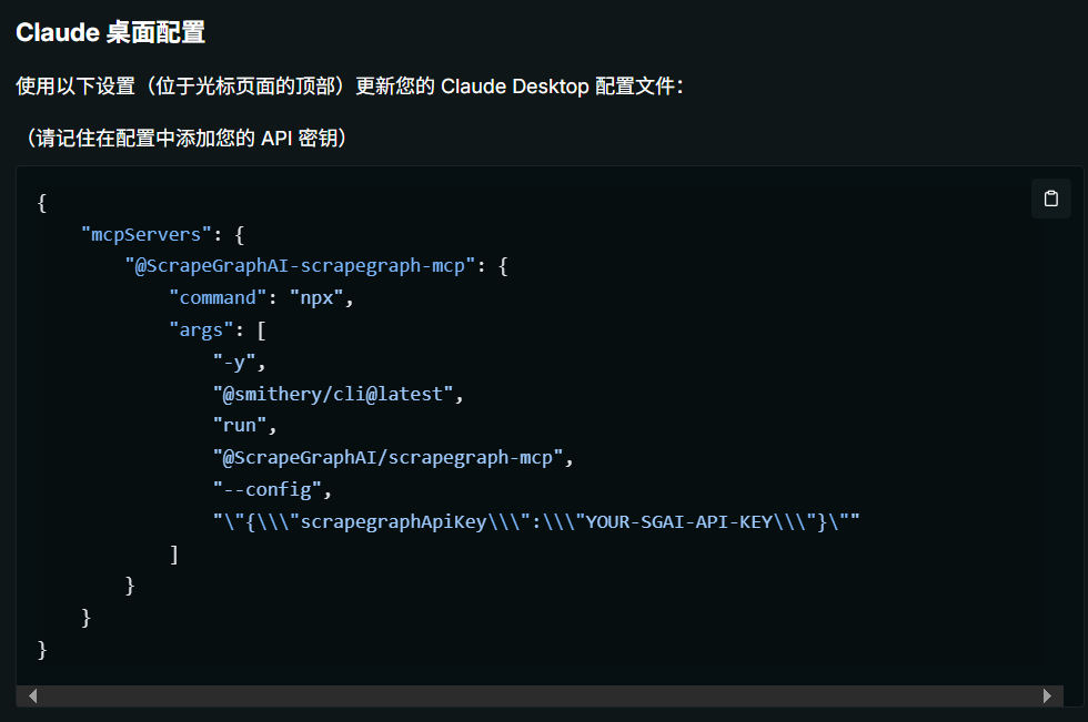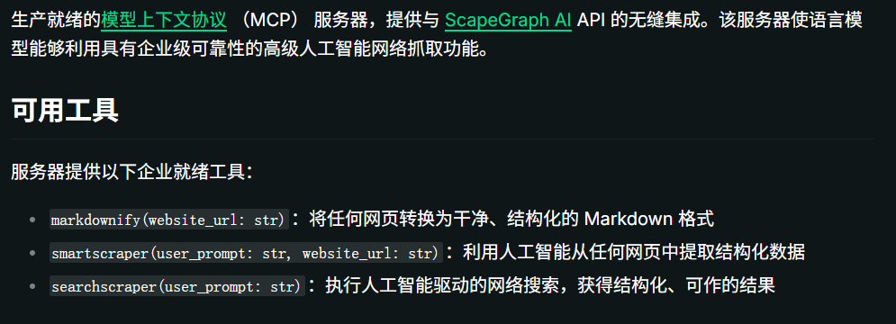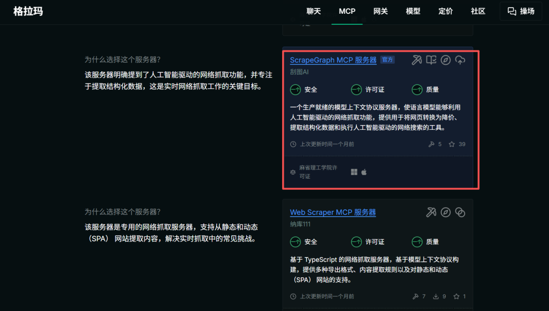 网站列出了所有可以实现实时网页爬取的服务器,还会表明为什么选择这个服务器。这里我选择了一个一个月前刚更新,官方版本的ScrapeGraph MCP Server。