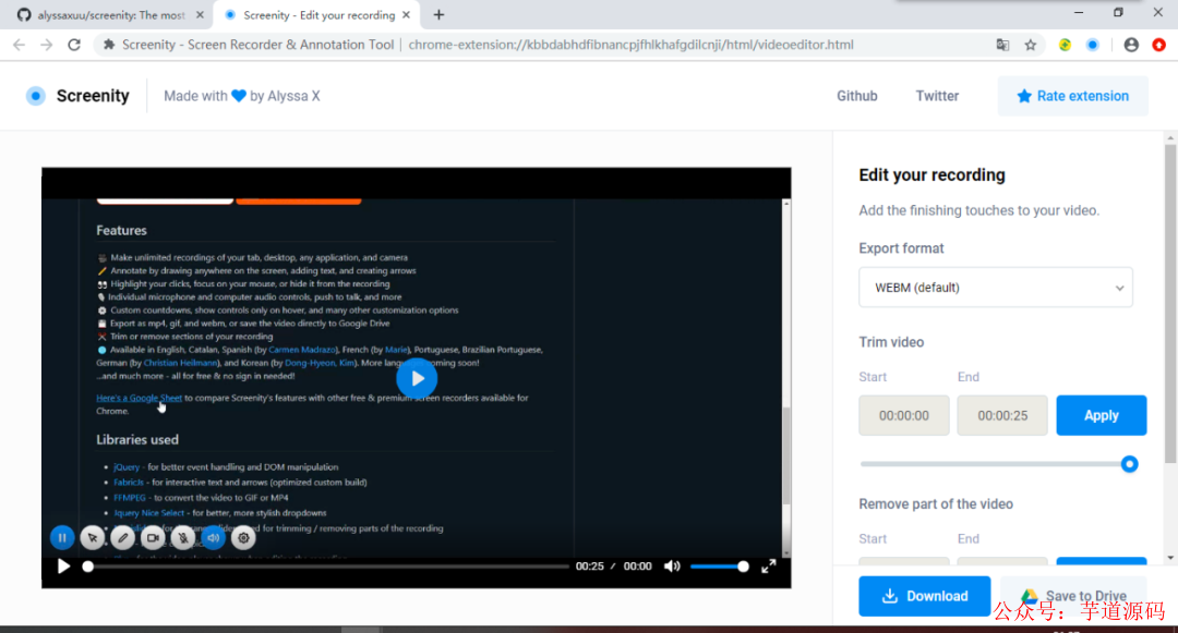 - 导出与分享: Screenity 支持将视频导出为多种格式,包括MP4、GIF 和 WebM,甚至可以直接保存到 Google Drive 方便分享。