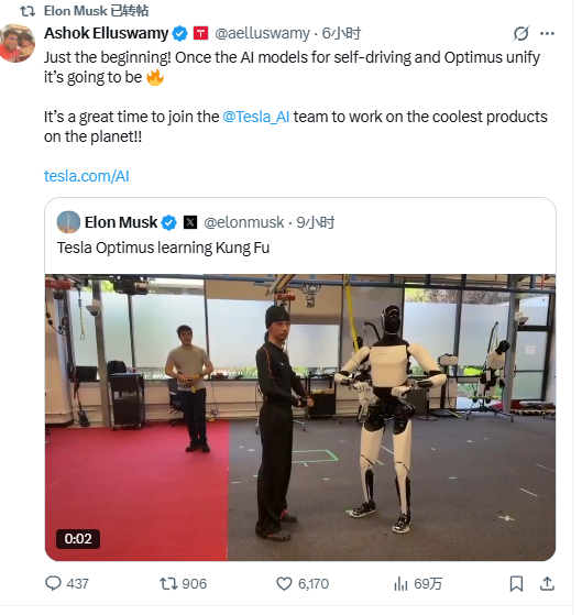 1.【特斯拉AI工程师回应擎天柱学功夫视频:这只是开始】特斯拉负责自动驾驶出租车和机器人领域AI工作的工程师阿肖克·埃卢斯瓦米(Ashok Elluswamy)转发马斯克发布的擎天柱机器人学习功夫的视频,并评论称:“这只是开始!一旦自动驾驶和擎天柱的 AI 模型实现统一,那就太燃了!现在正是加入特斯拉AI团队、参与研发地球上最酷产品的好时机!”马斯克转发了埃卢斯瓦米的这条帖子。(每日经济新闻)