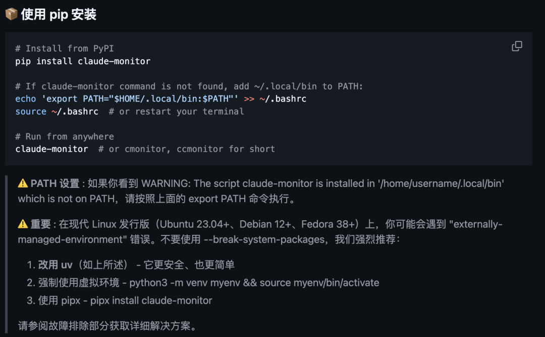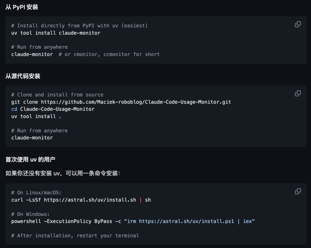 Claude Code Usage Monitor 是一个专门用来实时监控 token 使用情况的开源工具。它运行在终端中,以清晰美观的界面展示用量数据,并支持预测和预警功能,帮助用户合理规划使用量,避免超额。它提供多种显示模式,包括实时监控、每日汇总和月度统计,让你可以从不同时间维度了解自己的使用习惯。该项目完全开源,提供多种安装方式,推荐使用 uv 或 pip 进行快速安装,支持在 Linux、macOS 和 Windows 系统上运行。02